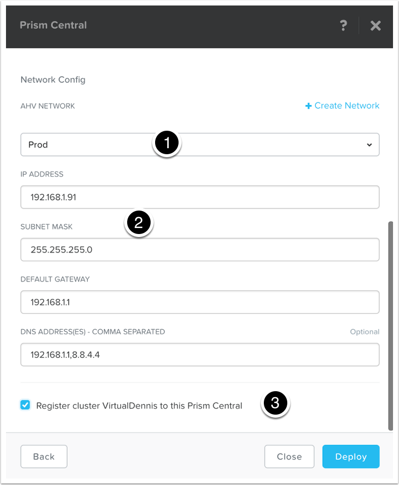 Choose the network that the Prism Central VM will be attached to (1). Fill out the IP address and network information that will be used for the Prism Central instance (2). Finally, select the checkmark box to register this cluster with the newly created Prism Central instance (3).
