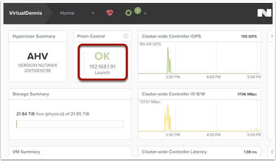 To launch Prism Central, click on the “Launch” option under the Prism Central widget on the Home screen. Alternatively, you can also browse directly to the IP address shown.
