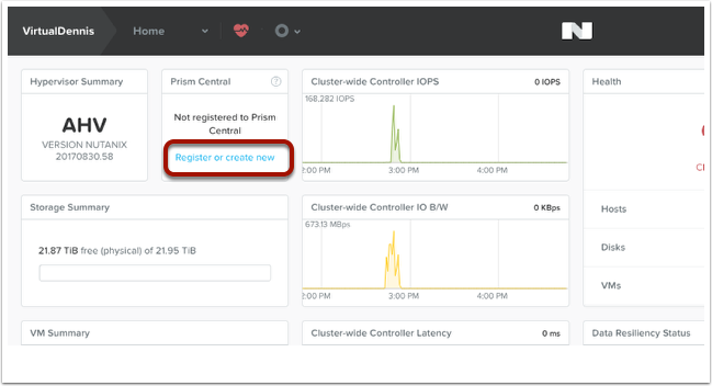 From within Prism Element (Prism for the cluster), click on the “Register or create new” option under the Prism Central widget, located on the Home screen.