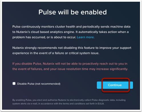 Nutanix clusters use our “Pulse” feature to create a SSL tunnel back to our support organization for phone home alerts and performance metadata. This enables us to proactively reach out to you in case of hardware issues or other cluster related alerts that need to be diagnosed. Click on the “Continue” button to leave Pulse enabled.