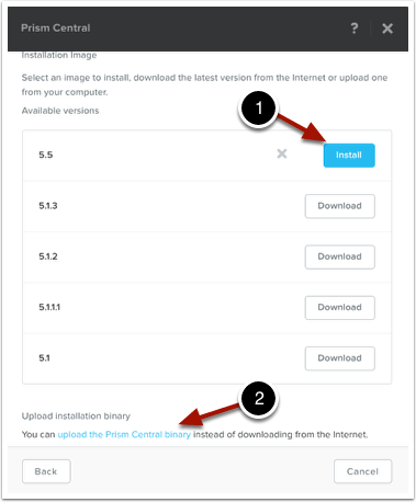 If the current version isn’t listed, compared to what is on the customer portal at https://portal.nutanix.com, use the “Upload the Prism Central Binary” blue link (2) to upload the latest version downloaded from the portal.