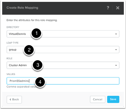 Select the Active Directory name from the dropdown box (1). Choose the LDAP type that you want to use. You can choose Group, User or (Domain) OU (2). Next, choose what cluster role these user(s) will be given (3). Under the “Values” section, enter the group/user/OU that will be given permissions to the cluster (4).