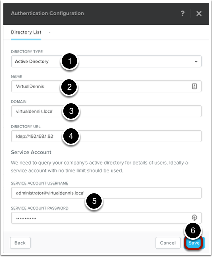 Fill out the appropriate fields, including Directory Type (1), a name for this connection (2), the fully qualified domain name (3), and the directory URL using the “ldap://ip-or-host-name” or “ldaps://ip-or-host-name” syntax (4). The default LDAP port number is 389. Nutanix also supports LDAPS (port 636) and LDAP/S Global Catalog (ports 3268 and 3269). Next, enter a service account with enough domain privileges that it can query the domain, using the “username@domain.local” syntax (5). To continue, click on the “Save” button (6).