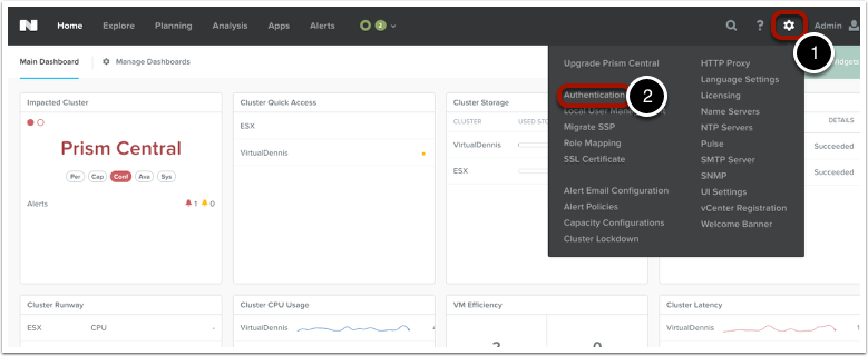 To configure Prism Self Service, we will need to setup domain (or ldap) authentication. To do this, log into Prism Central as an admin user, then click on the “Gear” icon in Prism Central (1), then click on “Authentication” (2).
