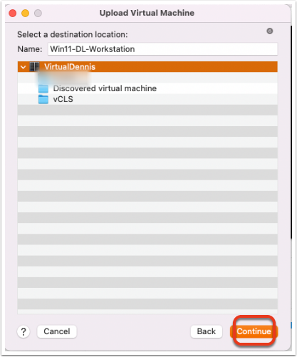 On the next screen, choose which VM folder you want the virtual machine to be placed in. I didn’t really want it in a folder, so I just chose the main datacenter, named “VirtualDennis”. Once you choose a location, click on the “Continue” button.
