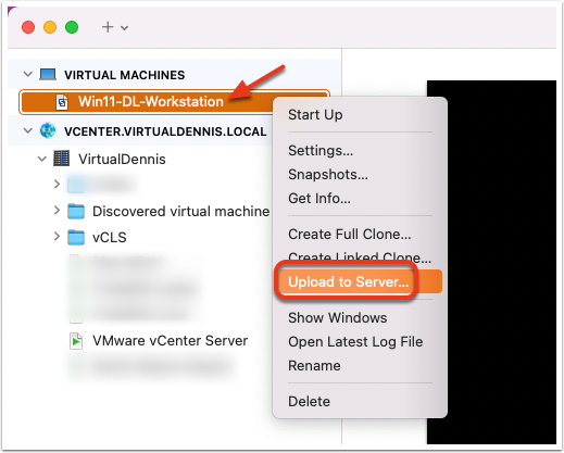 Once vCenter (or the standlone ESXi server) is connect, a list of VMs that are already in the environment will be shown. On your local VM that you have converted, right click on it, and choose “Upload to Server”.