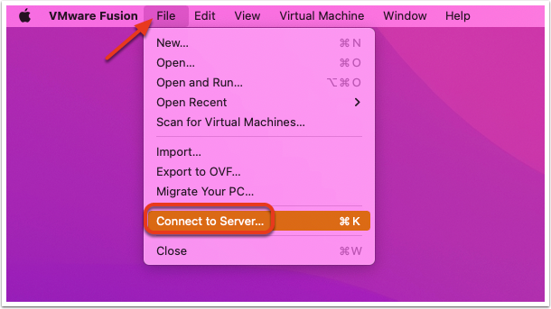 Next, in VMware Fusion, click on the “File” menu, then choose “Connect to Server”. This will connect VMware Fusion to a vCenter instance or to a standalone ESXi server. This will make transferring the VM from your Mac to your ESXi environment very easy.