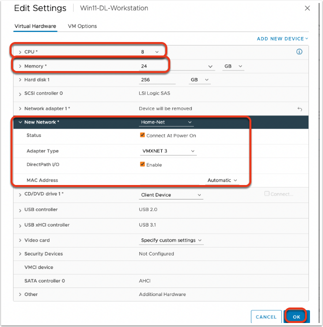 Once in vCenter, I had to change some of properties of the VM as they were different than the original VM, and different than what I wanted to use. In my case, I changed the number of CPUs (and vCPUs), the amount of RAM and I removed the E1000 network adapter that was listed and replaced it with the VMXNET 3 type of adapter. Once you change any settings that are needed, click on the “Ok” button to save the changes.
