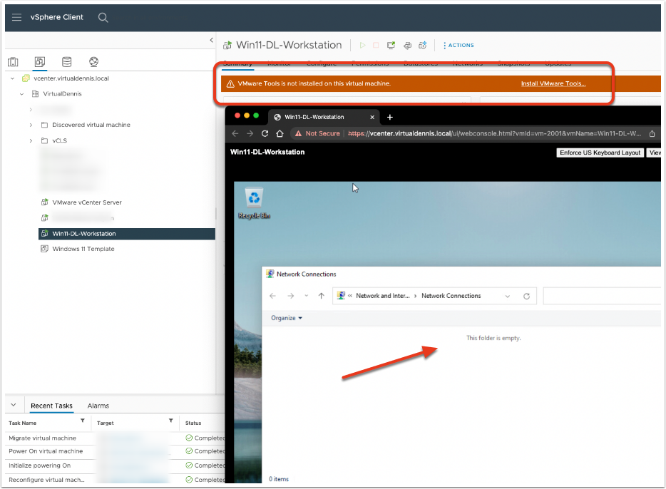 Boot up the virtual machine. In my case, VMware Tools was not installed yet, so my network adapter wasn’t shown. The vSphere Client prompted me to install VMware Tools via the link in the message.