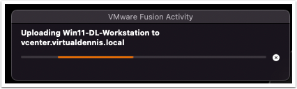 Once the upload starts, a window will be shown with the status of the upload process. Note: I noticed when I clicked off of the VMware Fusion window into another app, the progress window would not be shown. Once clicking back onto VMware Fusion, it would appear again.