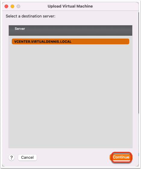 In the next window, select the destination server for where you want to upload your VM. In my case, I would choose my vCenter instance. Then choose “Continue”.