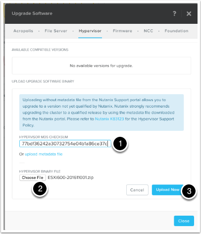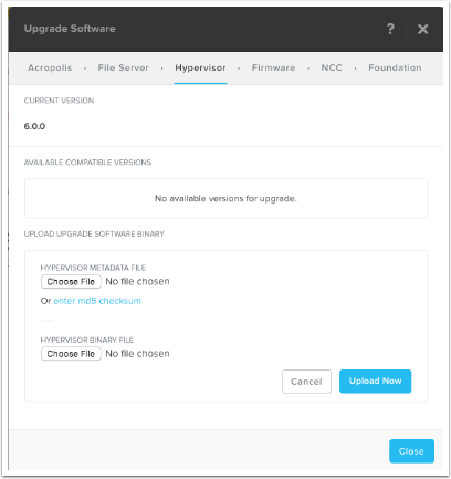 For ESXi, we will need to upload the ESXi offline patch binary (which you’ll need to download from the VMware download site). Nutanix qualifies specific VMware ESXi hypervisor updates and provides a related JSON metadata upgrade file on the Nutanix Support Portal (http://portal.nutanix.com).