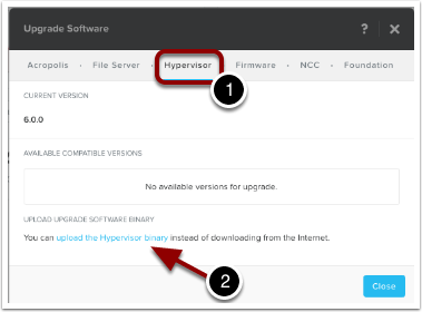 Choose the “Hypervisor” tab (1). Then choose the blue link that says “upload the Hypervisor binary” (2).