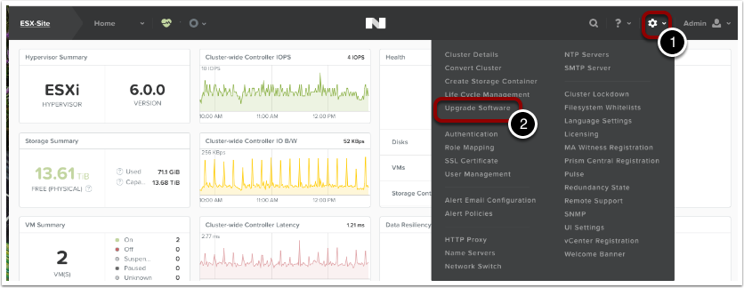 To enter into the one-click upgrade area within Prism, click on the “gear icon” (1) in Prism. Then choose “Upgrade Software” (2).