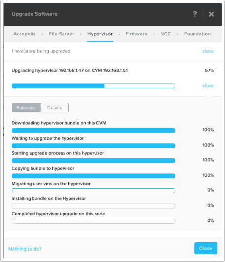 Once you fix any issues identified in the Pre-Upgrade checks, the upgrade will continue. You can monitor the steps here in the upgrade screen, or in the “Tasks” menu in Prism. You can also close the Upgrade Software screen to do other tasks in Prism if you would like while the upgrade is happening.