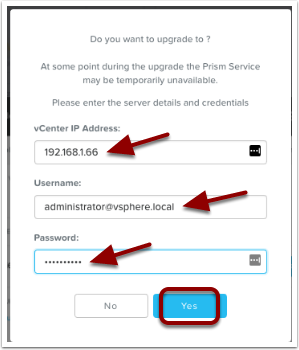 Prism will now prompt you to enter your vCenter IP Address, username and password. Then click on the “Yes” button to proceed.