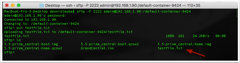This will SFTP using port 2222 and login with the “admin” user. Replace “cluster-vip” with your cluster virtual IP (VIP) address. Replace “container-name” with the container name as shown in Prism.