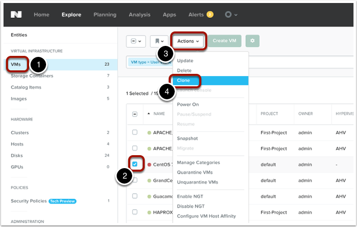 Under the Explore menu, click on “VMs” (1), then find the VM you wish to clone from (2), click on the “Actions” menu (3), then choose “Clone” (4).