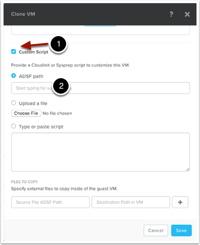 At the very bottom of the Clone VM screen, you will see a check-mark box that says “Custom Script”. Go ahead and checkmark the box (1).